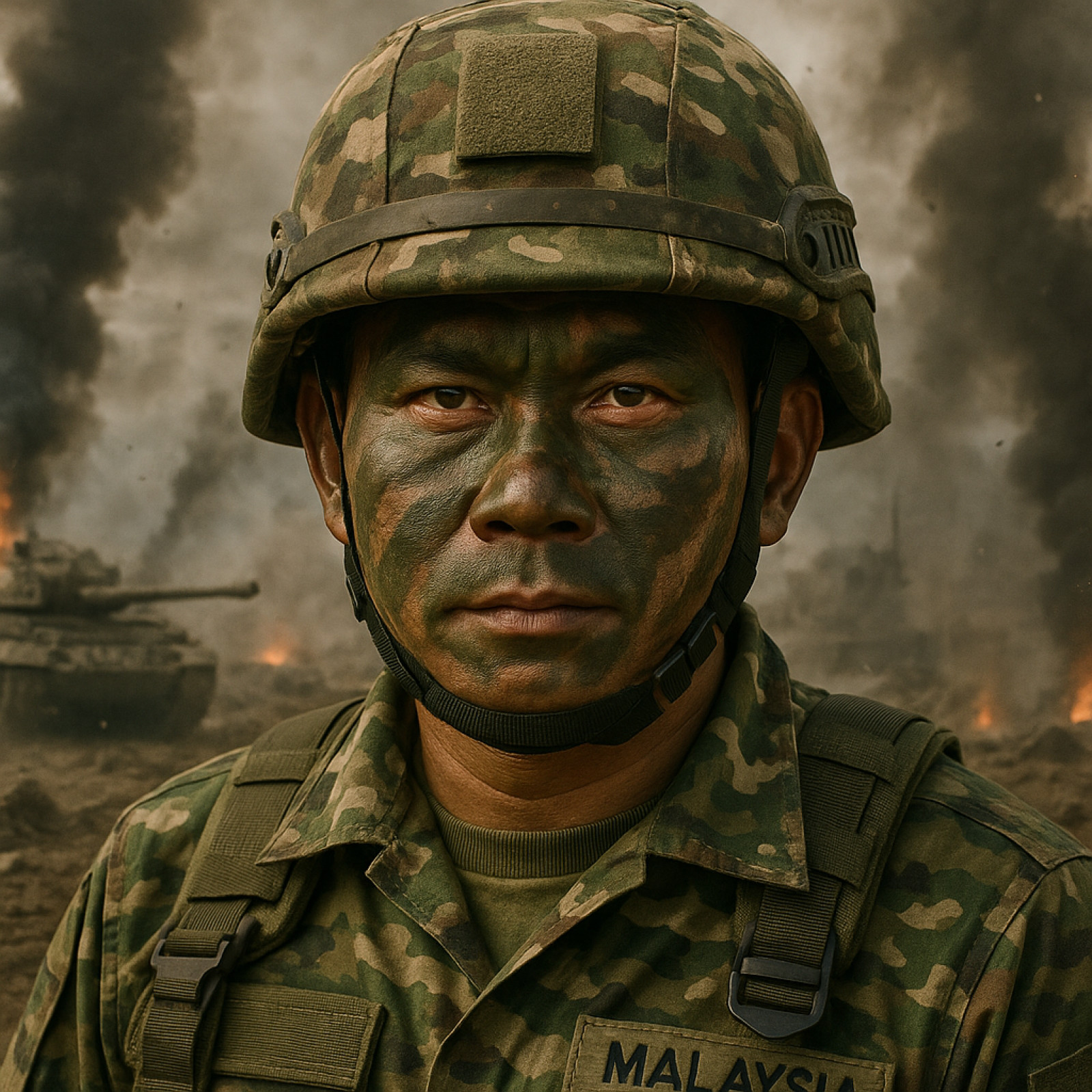 Note: I ask chatgpt with this prompt. Malaysian army style. Change the shirt to an army uniform (camouflage). Add a helmet or tactical gear. Place a background of a war zone (e.g. battlefield, smoke, military vehicles).